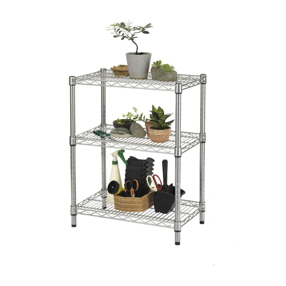 SCAFFALI PER ESTERNO in filo d’acciaio con finitura speciale zincata e verniciata cromata. Adatto all’uso in esterni.